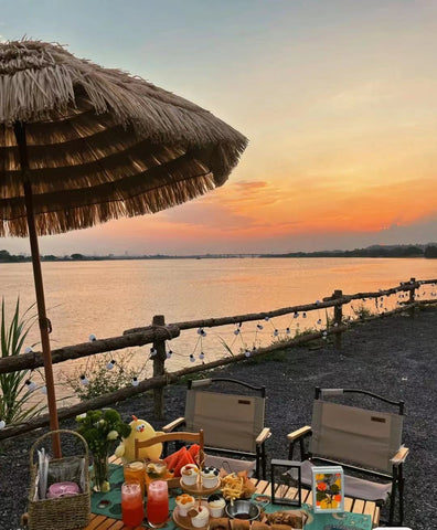 The first camping trip in autumn, Watching the beautiful sunset by the river is beautiful!
